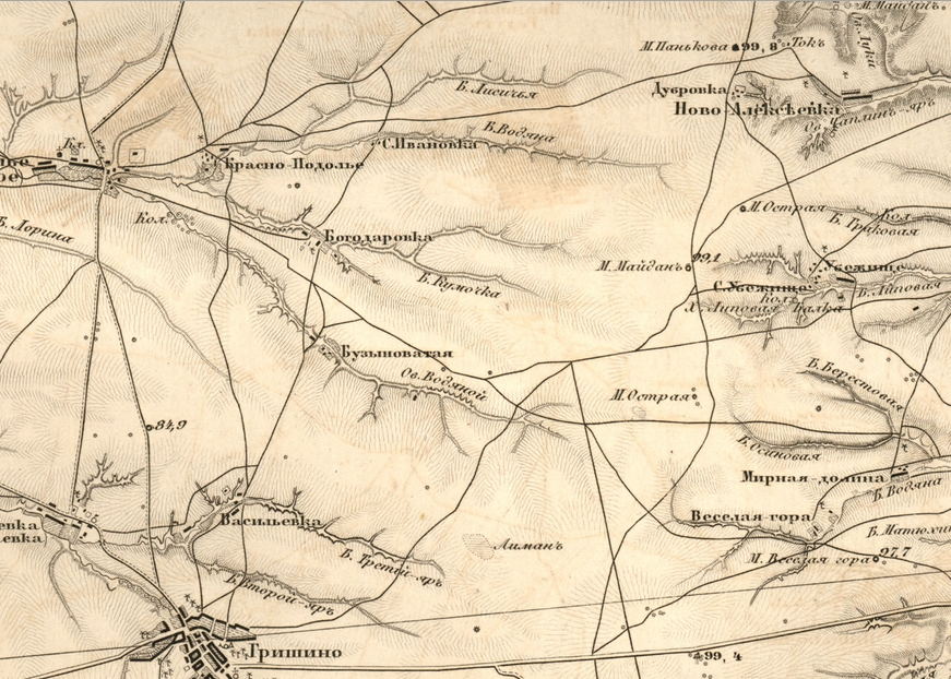 донбас, на карті перекладені з української на російську топоніми. місцеві були україномовні в той час. крім можливо гришино(зараз красноармійськ)