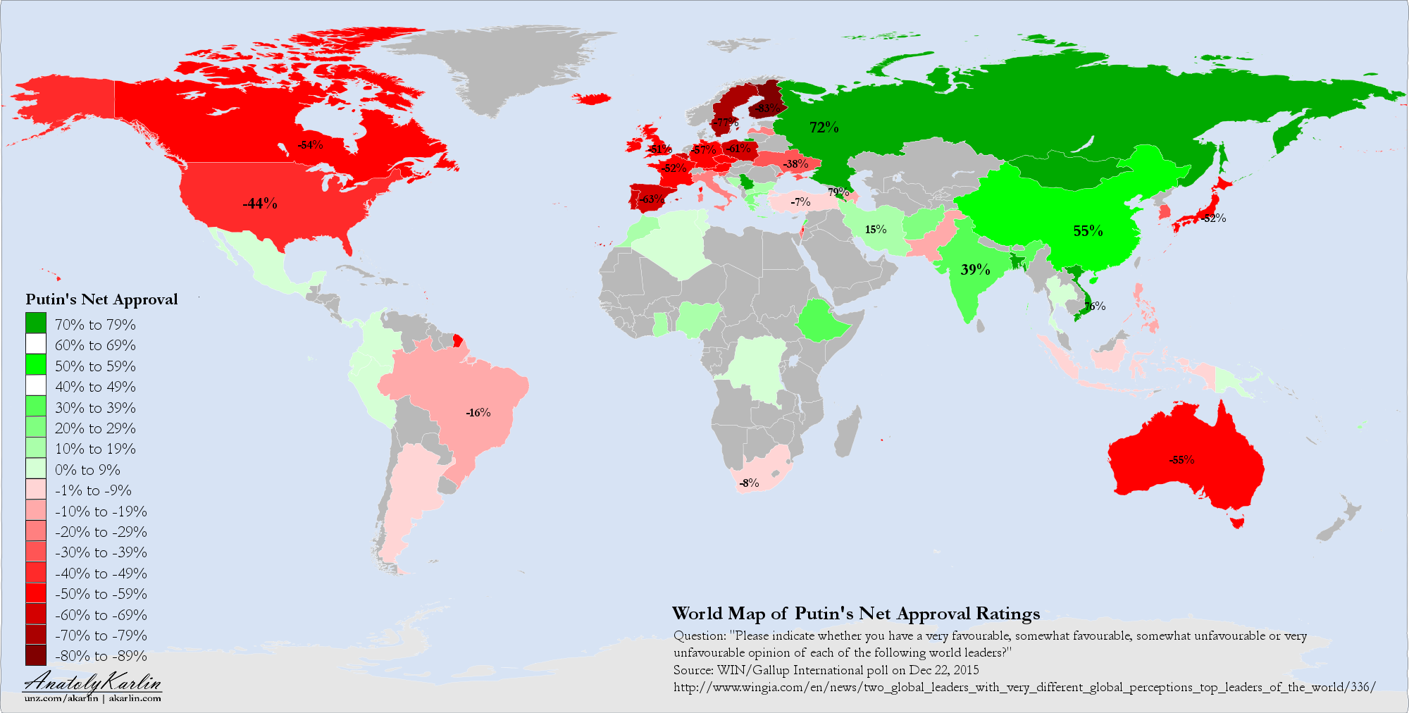 Зеленим позначено країни, що їх мешканцям подобається Путін