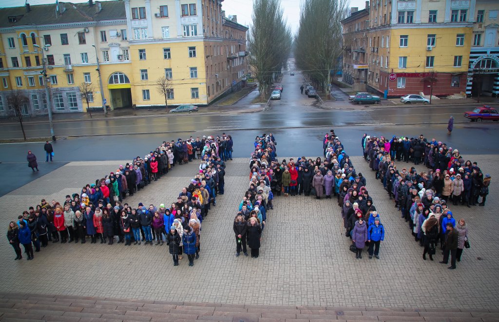 Фото обрезанно, там еще детишки  ,  справа в скобках (в составе Украины) образуют надпись.