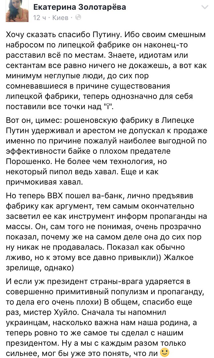 Рідкісна хуйня від мінстеця. Липецька фабрика нікак нє продавалась із-за нєхорошева Хуйла. Тому вона героїчно працювала, платила податки кацапам, за які вони споряджали гумконвої зі зброєю гополченцям. Ну не міг барига Пєця її закрити, зрештою, спалити к чортовій матері, бо його прокляв би Бог Бізнесу, який вище від народів і моралі.