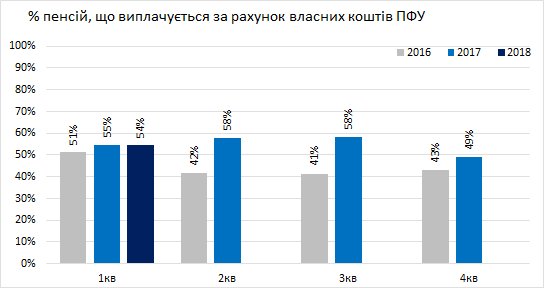 Важливо, що з власних надходжень ПФУ виплачується 54% (на рівні 2016).
