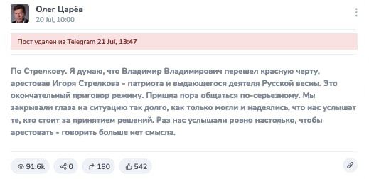 "Да, я написал заявление на Стрелкова в прокуратуру четыре дня назад. И да, я действительно сотрудник ЧВК "Вагнер", дважды ездил в командировки хирургом. Стрелкова я считаю "военной Блиновской": собирает большие донаты якобы на помощь нашим ребятам, а за потраченные средства не отчитывается. Последней каплей, конечно, стали слова Стрелкова о нашем президенте Владимире Путине. Считаю, что оскорбление первого лица государства - это преступление. Не могу пока точно сказать, после моего заявления задержали или нет, перед простым хирургом Генеральная прокуратура не отчитывается. Но, надеюсь, что именно я дал ход делу", — подчеркнул он.