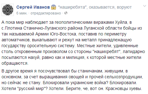 Цей серіал можна продовжувати до наскінченності. З одногу боку засилання грушників,козачків та інших найманців плюс підживлення місцевим люмпеном(за гроші звичайно),з другого боку короткочасні набіги "чорних чоловічків", Нацгвардії та інших силовиків.