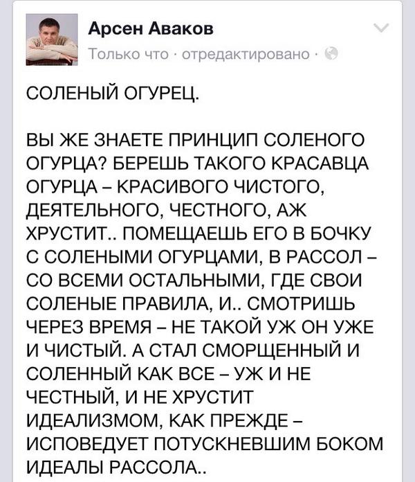Вы же знаете принцип соленого огурца? Берешь такого красавца огурца – красивого чистого, деятельного, честного, аж хрустит... помещаешь его в бочку с солеными огурцами, в рассол – со всеми остальными, где свои соленые правила, и... смотришь через время – не такой уж он уже и чистый. А стал сморщенный и соленый как все – уж и не честный, и не хрустит идеализмом, как прежде – исповедует потускневшим боком идеалы рассола...
