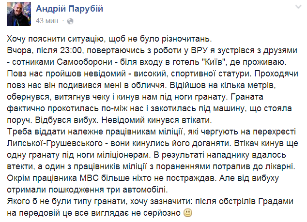 По данным ведомства, событие произошло, когда неизвестный молодой человек бросил в сторону народных депутатов Украины взрывчатку. Сейчас эксперты -криминалисты устанавливают ли это граната РПГ -5, или светошумовая граната.