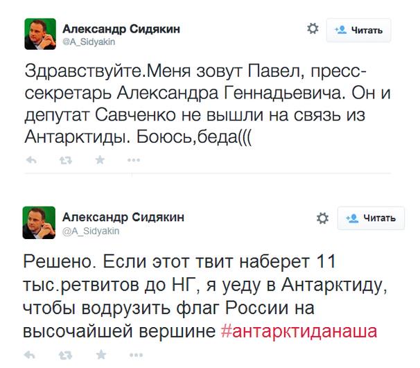 Депутаты Госдумы Александр Сидякин и Олег Савченко нашлись в Антарктиде . Об этом в среду, 14 января, сообщает в своем твиттере корреспондент русской службы «Би-би-си» Ольга Ившина.