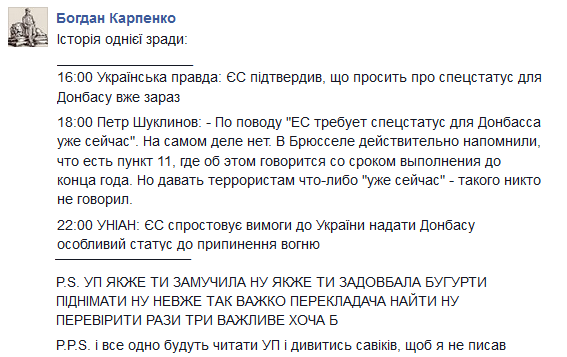 Раніше ЗМІ з посиланням на представництво ЄС в Україні повідомили, що ЄС звертається до української сторони з пропозицією надати Донбасу особливий статус, не чекаючи, поки бойовики і РФ виконають перші пункти мінських домовленостей.