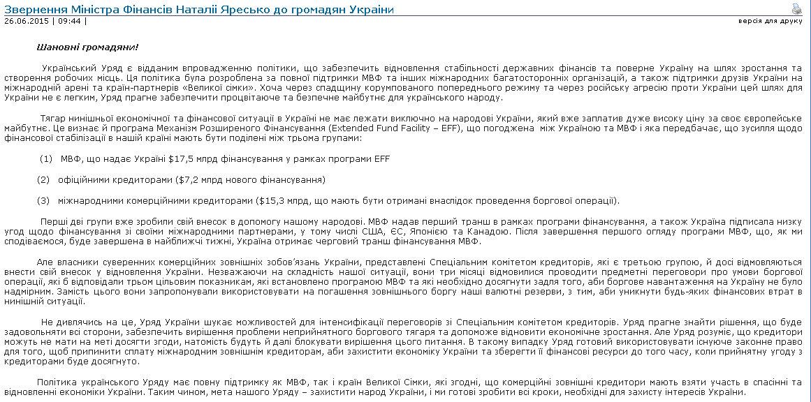 Яресько четко дает понять держателям долга что если он не хотят удовлетворится тем что предложил МВФ они вообще ничего не получат. МВФовцы четко дали понять что с их стороны финансирование будет несмотря на дефолт, вот и вся песня.