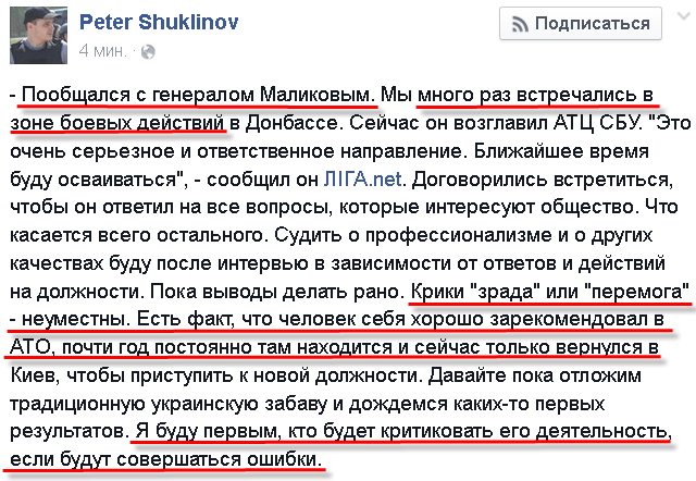 Так, народ, вижу нехорошие дяди пытаются раздуть скандал из назначения Маликова на должность главы АТЦ при СБУ. Я не буду углубляться в его биографию и писать о том, хороший он или плохой. Вступать в полемику и дискуссии тоже не буду. Хорошее или плохое это назначение покажет время. Но хочу, чтобы вы все знали одну важную вещь: Маликов уже год как прикомандирован к АТЦ. И проходил службу на должности заместителя АТЦ при СБУ. Назначен он на эту должность Турчиновым (Кровавый Пастор), в бытности его и.о. президента Украины 07.04.2014 года. Пока все.