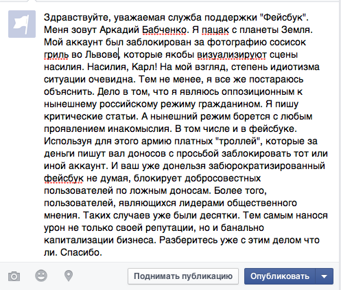 Вот, за эту публикацию, если не удалю,  ФБ грозится заблокировать меня на 7 суток! Дермократия в действий. Viva Ольгино и кремлевские бляди!
