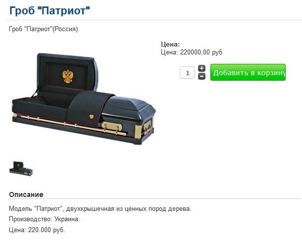 Московская городская ритуальная служба в перечне своих услуг предлагает элитный гроб "Патриот" с двуглавым орлом производства Украины. Сообщение о продаже размещено на сайте ритуальной службы.