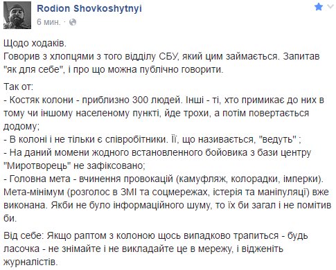 "Я, сподіваюся, коли всі ці колони зустрінуться і зіллються в одну, то підуть далі на Москву, молити її про мир і припинення війни. А ще краще –нехай вони дійдуть до не контрольованої частини українськ-російського кордону, стануть вздовж кордону плечем до плеча з іконами у руках і не пускатимуть через нього танки, гармати і анархістів з військовими квитками", - вважає Курков.