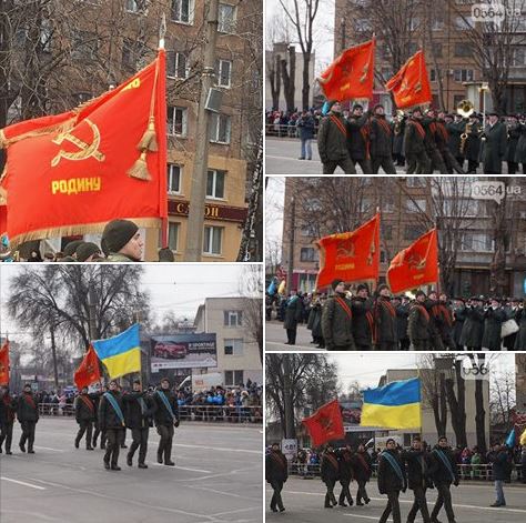 У соцмережах викликали широкий резонанс фотографії з заходів з нагоди 73-ї річниці визволення Кривого Рогу від німецьких загарбників, під час яких військовослужбовці однієї з дислокованих у місті частин НГУ несли червоні прапори з радянською символікою. Фотографії опублікувала у Facebook волонтер Юліана Березуцька. Поруч з радянськими прапорами несли українську символіку.