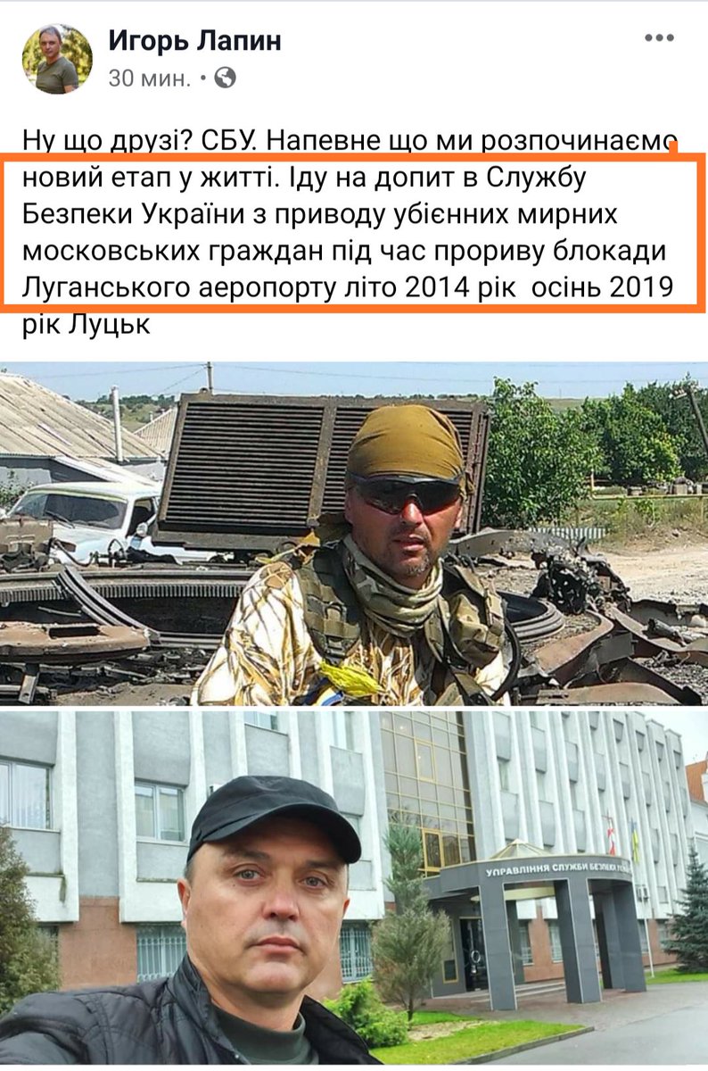 Нардеп також додав, що в СБУ його викликали "у кримінальній справі щодо вбивства громадянина РФ". Так, Лапін зазначив, що допитали його у Волинському управлінні. Він нібито проходить у справі про прорив блокади Луганського аеропорту влітку 2014 року. За словами колишнього АТОвця, силовики розпитували його про загибель російського військового. Той нібито був поранений під час бою неподалік аеропорту.