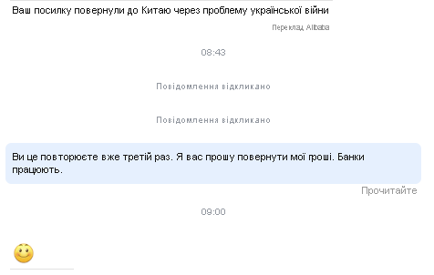 Китаєць - Вибачте, ваш посилку повернули через проблему української війни. Китай не підтримує його відправку.