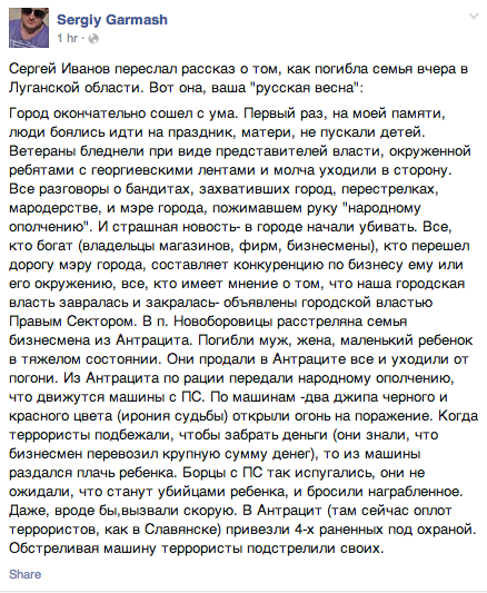 А знаєте, чому вони почали стріляти? Бо їхні дебіли-соратники передали їм по рації, що то їде "Правий сектор"...