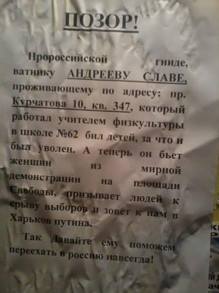 А вот я не пойму... Допустим тот чел действительно провинился. Почему клеят листовку, а не идут лично с ним разбиратся? Кишка тонка или может хочется все сделать чужими руками?