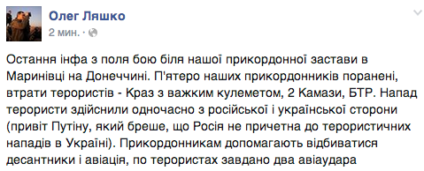 Нагадаємо, зараз триває бій прикордонного загону у Маринівці із переважаючими силами терористів. Одна із машин супротивника увірвалась на територію України з російського боку.