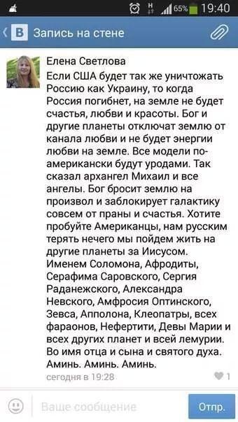 "Дорогие друзья! Наше собственное орловское и ахалтекинское мясо заменит нам американских коров, которых станет трудно выращивать в радиоактивных руинах. Не хочу специально пугать кого-то, но я не выспался сегодня и не собираюсь делать этого впредь. За обрушением нашей валюты Америкой стоит Англия, вечная цель которой - немецкими руками натравить Францию на Россию. Мы ценим дружбу с Украиной, предавшей наш союз, это братский нам народ, и не будем молча смотреть, как он пялится на Запад, который пялит его и нас. Князь Владимир крестился на земле Крыма, здесь покоятся мощи его бровей, отстоим их, каждый русский обязан хоть раз в жизни за что-нибудь умереть. Если не в бою, так хоть с голоду. Которого не будет, потому что ракеты летят быстрей, чем звучат команды, потому что лучше умереть во сне, чем жить на коленях гея".