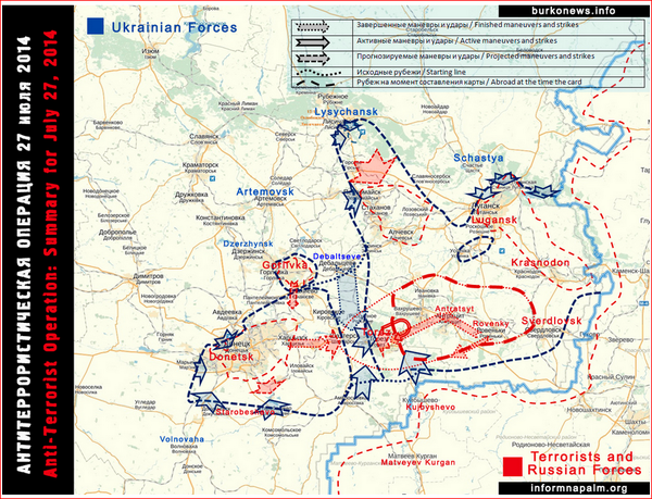 - Продолжается операция сил АТО по освобождению н.п.Лутугино, Шахтерск, Торез и уничтожению группировки террористов в районе кургана Саур-Могила. Расширяется зона, контролируемая силами АТО, в районе н.п.Горловка.