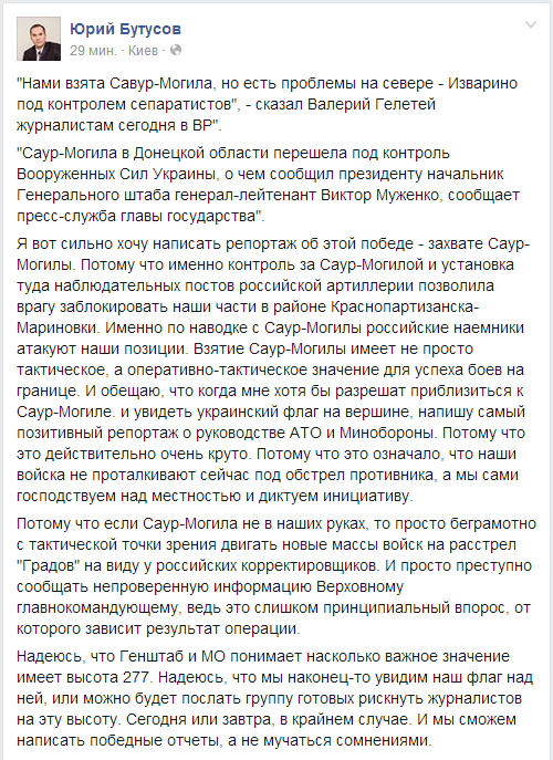 "Такое впечатление, что верхушки силовиков заинтересованы в затяжной бойне, если третий месяц не стремятся перекрыть этот источник (прим. -‪#‎Суходольск‬, Северный, Поповка, Пархоменко) ежеднеееееевного прохода техники из России! Это неиссякаемый поток подкрепления террористам! Как достучаться, докричаться к верхам?! По выкладываемым телефонам на их сайтах не позвонишь - прослушиваются. Люди пишут,предупреждают а реакции министров - "ноль" и президенту, вероятно, не докладывают о таких промахах, за свое кресло дрожат, а ребята гибнут! А потом опять будут удивляться откуда проходят танки, БТРы, ГРАДы, АКАЦИИ и машины со снарядами и наемниками?!..." .