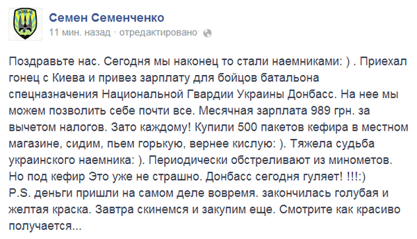Поздравьте нас. Сегодня мы наконец то стали наемниками: ) . Приехал гонец с Киева и привез зарплату для бойцов батальона спецназначения Национальной Гвардии Украины Донбасс. На нее мы можем позволить себе почти все. Месячная зарплата 989 грн. за вычетом налогов. Купили 500 пакетов кефира в местном магазине, сидим, пьем горькую, вернее кислую: ). Тяжела судьба украинского наемника: ). Периодически обстреливают из минометов. Но под кефир Это уже не страшно. Донбасс сегодня гуляет! !!!:)