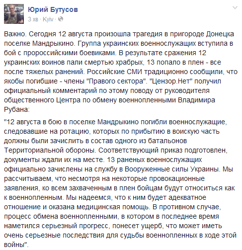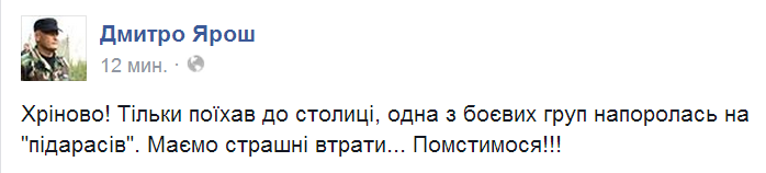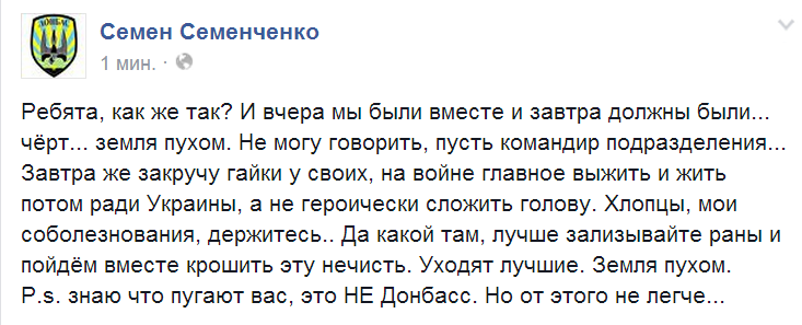 Ребята, как же так? И вчера мы были вместе и завтра должны были... чёрт... земля пухом. Не могу говорить, пусть командир подразделения... Завтра же закручу гайки у своих, на войне главное выжить и жить потом ради Украины, а не героически сложить голову. Хлопцы, мои соболезнования, держитесь.. Да какой там, лучше зализывайте раны и пойдём вместе крошить эту нечисть. Уходят лучшие. Земля пухом.