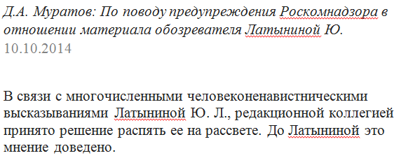 В заметке Латыниной от 10 сентября 2014 года Роскомнадзору не понравились два отрывка. По мнению ведомства, изложенные в тексте тезисы подпадают под статью 11 закона о противодействии экстремизму, в которой говорится о недопустимости экстремистских материалов через средства массовой информации.
