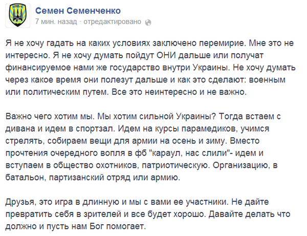 мне тут набросали в карму минусов за цитату статьи с Деловой Столицы. А об вчерашней статье с инсайдера что скажете ? Тоже ватный ресурс ? Я понимаю, что тут 99% диванные войска, которые смакуют военные действия, лежа на диване. Но мне кажется, что пора прекращать войну и 50-км демилитаризованная зона может быть компромиссом с хуйлом на какое-то время. Нам нужна передышка, надо провести выборы, получить высокоточное оружие, укрепить армию и т.п.