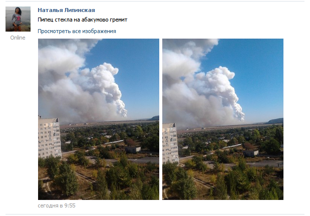 Также в соцсетях распространяются фото горящих полей. По данным пользователtй идёт обстрел из реактивной артиллерии ("Град" или "Ураган") 7-го блок-поста. Это выезд в сторону Донецка ("Сталевар"). Горят прилегающие поля.