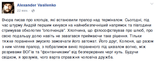"Справжньою кісткою у горлі для терористів залишаються позиції наших військ в районі аеропорту "Донецьк". Активна оборона наших "кіборгів" змушує ворога істерично кидатися у наступ. Застосовувати мінометно-артилерійський вогонь та реактивну артилерію. Кожен такий напад отримує гідну збройну відсіч", - заявляє прес-центр АТО.