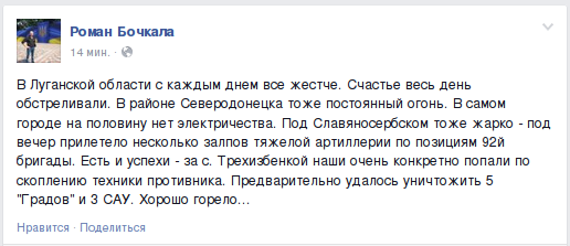 Однако сегодня интенсивность боевых действий в районе Счастье-Лисичанск-Смелое значительно снизилась. Украинское командование серьезно усилило группировку наших войск. Боевые порядки уплотнились. Сосредоточены достаточные резервы, в том числе бронетанковые.