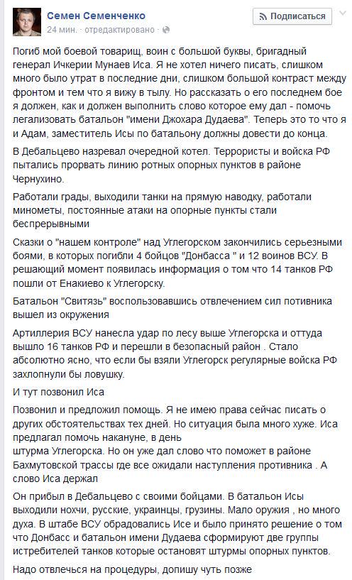 «Погиб мой боевой товарищ, воин с большой буквы, бригадный генерал Ичкерии Мунаев Иса», — написал Семенченко