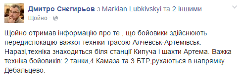 Никакого окружения Дебальцево на данный момент нет. Угроза есть, но российские заявления о полном окружении и "котле" - фейк. Утверждаю это категорически. Я первый написал про блокаду наших сил российскими войсками в секторе "Д", первым написал про окружение под Иловайском, и первым написал про окружение нового терминала в Донецком аэропорту. Поэтому прошу прекратить панику, я проверил информацию из различных источников. Трасса М-103 Артемовск-Дебальцево под украинским контролем. Противник ведет по ней беспокоящий огонь, но не прицельно, и не точно. Нельзя разгонять российскую дезинформацию. Это не только военные подтверждают и представитель МВД в штабе АТО Илья Кива, но и волонтеры. Волонтерам никакой нужды что-то придумывать нет, они заняты гуманитарными операциями. Наталья Воронкова вместе с Diana Makarova занимается вывозом детей и раненых из зоны боев. Они со своими друзьями постоянно вывозят людей из Дебальцево в Артемовск. Наталья сказала, что сегодня по трассе проезжало множество волонтерских экипажей, и несколько раз они видели как артиллерия российских отрядов бьет по дороге. Но эти спорадические обстрелы не могут остановить движение и снабжение.