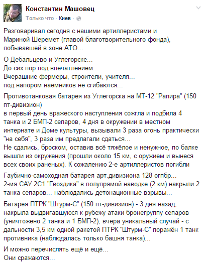 По Дебальцево получил не очень хорошую инфу. Идет очень сильный бой. Бои в самом Дебальцево. Остальное пока молчу.