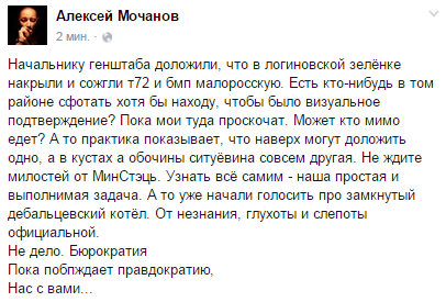 «Пошла зачистка района сосредоточения прорвавшихся сил противника (танк, 2 бмп, пехота) в районе Луганское- Дебальцево. Части ВСУ, противодиверсионная группа батальона «Донбасс», усиленная бронетехникой. Попытка перерезать дорогу жизни Дебальцево- Артемовск провалилась. На случай подхода свежих сил противника подтянуты значительные резервы. Идет бой. Слава Украине!», — написал он.
