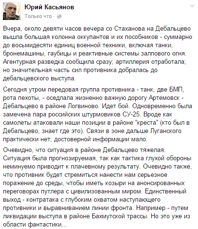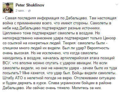"Над нами зафиксировано несколько пролетов групп боевых самолетов, которые наблюдали все наши бойцы в районе Новогригорьевки, вблизи Дебальцево. С утра мы подвергаемся сильным обстрелам, и в момент пролета самолетов по нашим опорным пунктам были нанесены ряд ударов боеприпасами большой мощности, которые мы на позициях расценили как бомбовой удар. Как только прекратится обстрел, я составлю об этом рапорт и отправлю по всей форме, свидетелями является весь наш личный состав. Сразу после сообщения на "Цензор.Нет" командование восстановило связь с нашим подразделением, которая отсутствовала 5 суток. Впервые за 5 суток мы получили эффективную артиллерийскую поддержку, и осуществляем корректировку огня по вражеским огневым точкам, непосредственно взаимодействуем с артиллерией. Каждого, кто считает, что мы придумали информацию об авиаударе, я приглашаю к нам под Дебальцево, на наши опорные пункты, можете проверить, провести экспертизу. Гарантирую незабываемые впечатления. Мы ведем непрерывные бои уже третью неделю, и ежедневно подвергаемся артобстрелам. Да, мне сейчас звонят и говорят, что я не должен был никуда звонить, но для меня важна безопасность личного состава, и я отвечаю, чтобы мои парни выполнили задачи с минимальными потерями".