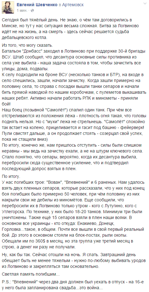 Сейчас Логвиново в руках террористов.Командование Национальной гвардии распотрошило части батальона Донбасс по разным секторам, поэтому мы не можем выступать как отдельная боевая единица, проблема остается также с оснащенностью боевой техникой. При использовании частей батальона как приданных к ВСУ, постоянно возникают проблемы с боевой слаженностью и отсутствием нормальной разведки со стороны частей ВСУ, доходящей в некоторых случаях до прямой дезинформации командования Нацгвардии со стороны старших командиров сектора ВСУ. Думаем, в ближайшее время, это станет предметом рассмотрения военной прокуратуры.