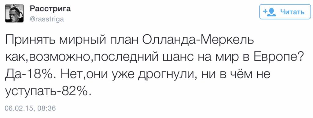 Гіпер-активність Керрі, Олланда і Меркель, які сьогодні перебувають у Києві, на переговорах з Порошенком, напрацьовуючи остаточний прийнятний для усіх сторін сценарій, перед поїздкої до Москви, для остаточного його політичного врегулювання з Путіним, досягає свого повного політичного апогею. Путін повинен визначитися остаточно до 9 лютого, коли Меркель у Вашингтоні з Обамою остаточно погодять сценарій саміту ЄС 12 лютого, враховуючи остаточну позицію Путіна, готового на ...подальшу ескалацію загострення конфлікту проти всього Світу, або готового з"їсти власного капелюха ганьби і скоритися перед світовим співтовариства, повністю погодившись виконати Мінські угоди у визначений конкретними рамками термін!