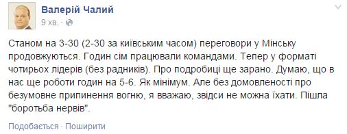 Бок Парашэнкі кажа, што перамовы працягнуцца яшчэ 5-6 гадзінаў http://bit.ly/1ykRrO4