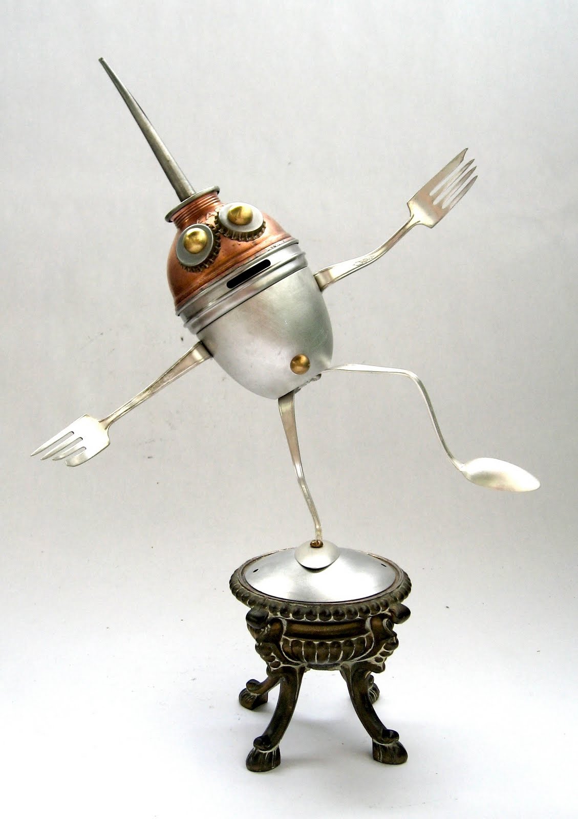 Американец Brian Marshall (aka Adoptabot) делает свои скульптуры из старых масленок, алюминиевых ложек, карандашных точилок и электросчетчиков.