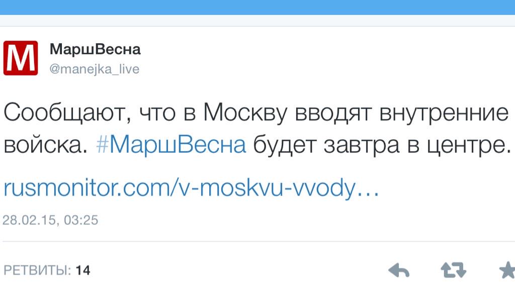 3. Главной идеей предстоящего 1 марта марша было "Прекратить войну с Украиной" (см. последнее интервью Немцова на Эхе). Теперь это требование "плавно" отошло на задний план, марш из протестного превращается в прощальный, акценты выгодно поменялись...