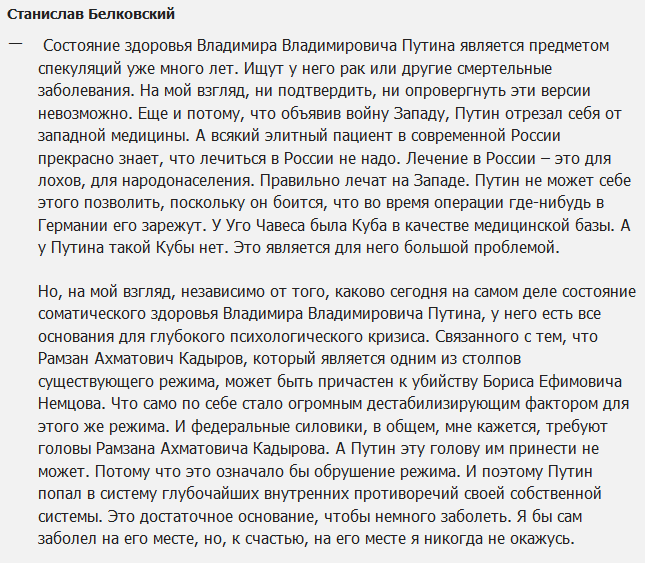 Он поехал лечиться, как я понимаю. Как он лечится? Не знаю. Может, по лесу гуляет. Может, с духовником беседует. Может, молится, может быть, пьет, хотя на него это не похоже. Одно понятно – ему надо определяться: или включать костоломку по образцу Сталина или ту же самую костоломку – только в адрес тех, кто убил Немцова.