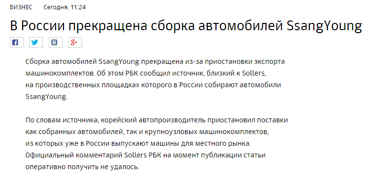 Южнокорейский автомобильный производитель SsangYong Motor приостановил экспорт автомобилей в Россию из-за падения рубля еще в январе 2015 года. По словам источника РБК, прекратилась и сборка автомобилей марки в России