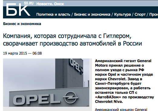 Opel полностью уйдет с российского рынка к концу 2015 года. Речь идет об остановке продаж моделей марки и сворачивании производства на автозаводе в Санкт-Петербурге.  А Chevrolet сведет свое присутствие в России до минимума — на российском рынке останутся только культовые модели Corvette, Camaro и Tahoe. Также на российском рынке останется премиальный бренд General Motors — Cadillac.