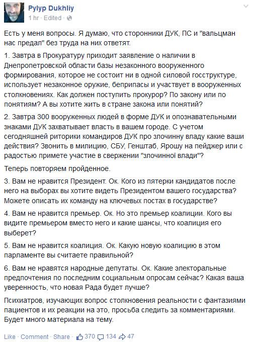Щойно на базі 5-го окремого батальйону ДУК "Правий сектор", яка вчора була оточена підрозділами ЗСУ, пройшов черговий раунд переговорів між командуванням ДУК Правий сектор та представниками ЗСУ. Переговори пройшли у конструктивному руслі. Позиція ДУК залишилася незмінною: ми погоджуємося увійти до лав ЗСУ лише як цілісне військове з'єднання, з нашими командирами. Ми вважаємо, що для зняття напруги в питанні легалізації ДУК ПС необхідно прийняти закон про Добровольчий Український корпус, і вже виходячи з цього закону, переходити безпосередньо до розгляду технічних питань входження ДУК до лав ЗСУ.