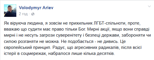 Апріорі, сексуальні меншини не можуть мати ніяких інших прав, окрім права закриватись в кімнати і робити там те, що захочуть. Будь-яке громадське висвітлення питань сексуальної орієнтаціє є аморальним - що посягає проти норм громадської моралі. Це, за аналогією, можна порівняти із мітингом сепарів у Києві, з вимогою права на статус УБД, для "ополченців": Теж, аморально, теж права, які вимагаються, відсутні у правовій природі норм.