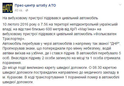 Під Мар'їнкою на міні підірвався мікроавтобус: 2 особи загинуло, 1 отримала поранення