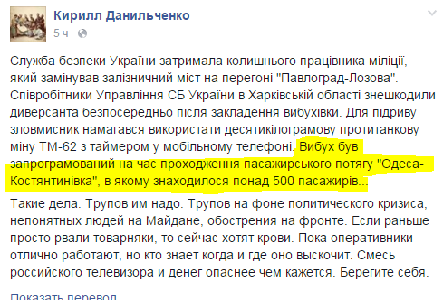 Співробітники Управління СБ України в Харківській області знешкодили диверсанта безпосередньо після закладення вибухівки. Для підриву зловмисник намагався використати десятикілограмову протитанкову міну ТМ-62 з таймером у мобільному телефоні. #Вибух був запрограмований на час проходження пасажирського потягу "Одеса-Костянтинівка", в якому знаходилося понад 500 пасажирів.