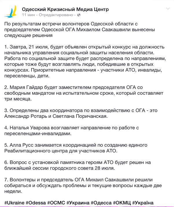 7. Волонтеры и председатель ОГА Михаил Саакашвили решили собираться и обсуждать проблемы и текущие вопросы каждые две недели.